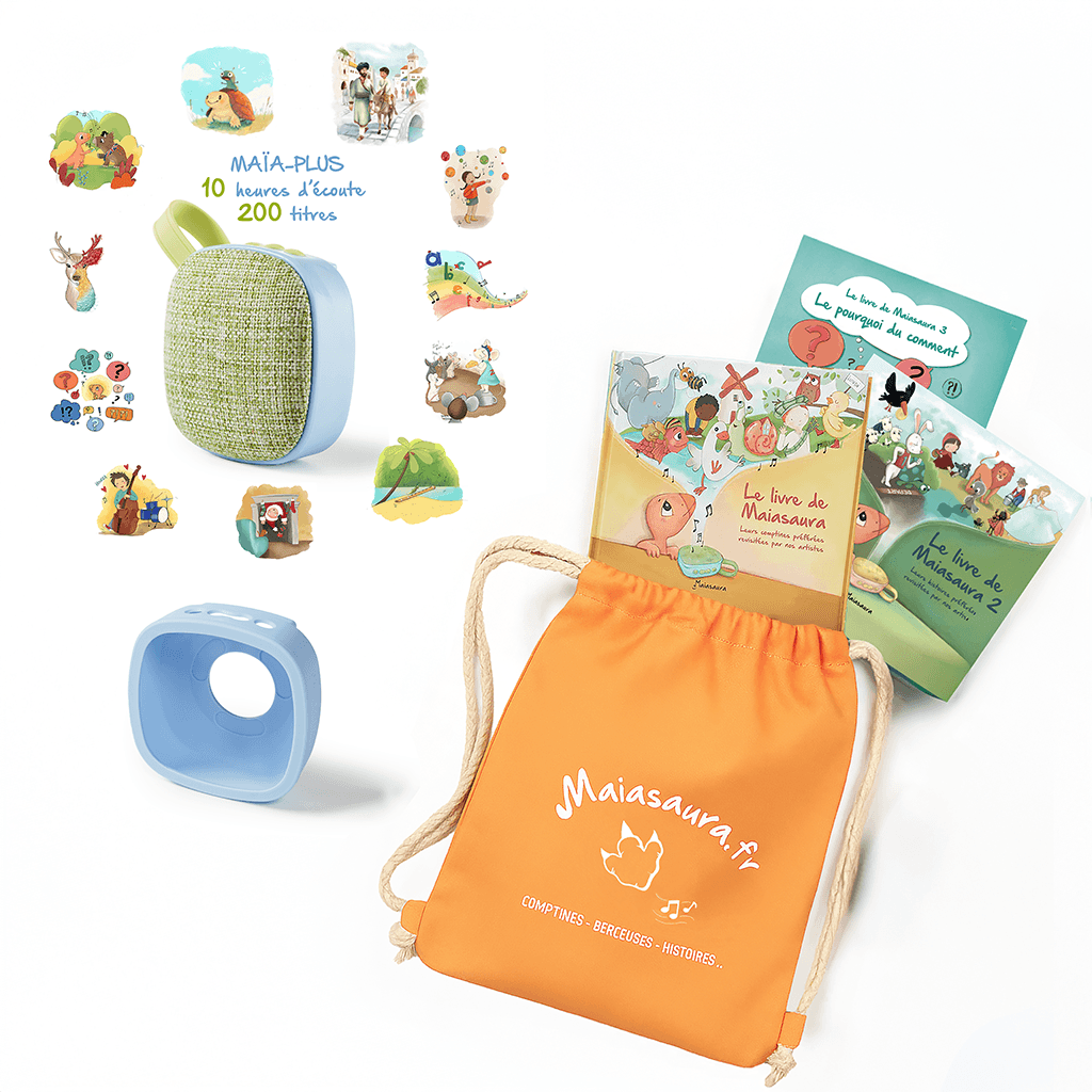 MAÏA : 100g, 85*85*30mm, Autonomie 5h, Haut-Parleur de qualité, adapté aux seuils auditifs des enfants, Carte Maiasaura (4Go) fournie avec : Comptines, Histoires, Berceuses + tous les contenus payants offerts